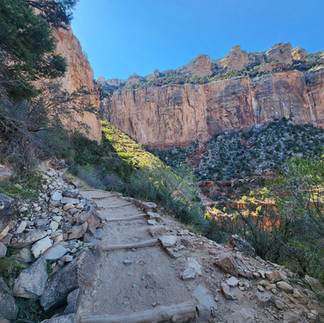 It began to become lighter around 5:45. By 6 AM, we no longer needed our headlamps, and we were able to see amazing views of cliffs above us and, at times, amazingly steep drop-offs to the side of the trail. It’s a long way down! I’d like to come back and do this section of the trail up to the North Rim someday and marvel at the scenery. From our vantage point now, it seems we missed some dramatic visuals since we had hiked it in the dark.